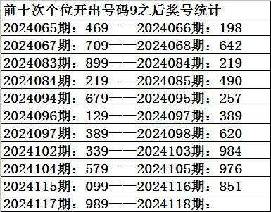 四、个位分析:上期开出号码9,前10次号码9出现之后下期同位号码为:8290790461,其中号码大小比为5:5,相等;奇偶比为4:6,基本持平;012路比为5:3:2,0路号码表现相对活跃。本期参考号码:0。