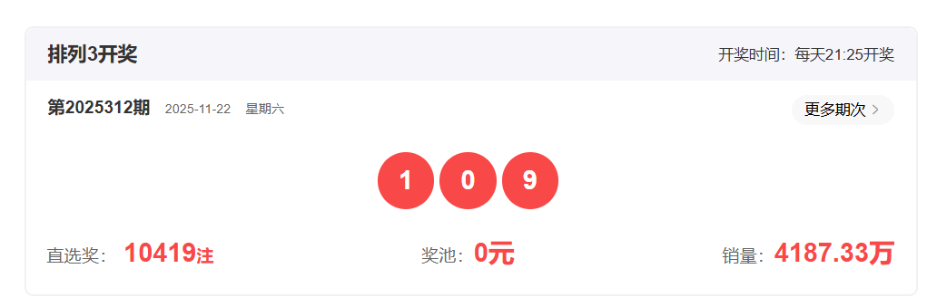 体彩排列3第2025312开奖号码109,形态为组六,奇偶比2:1,和值10,跨度9,大小比1:2,【012】路个数比2:1:0。