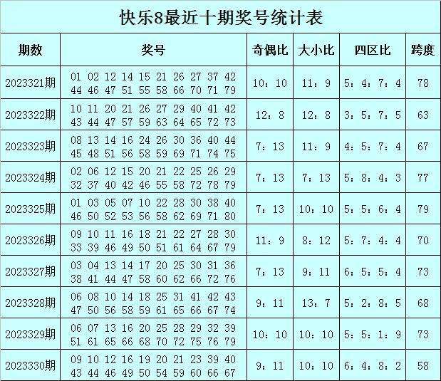 福彩快乐8第2023330期开奖回顾:09 10 12 16 19 20 21 23 39 40 43 44 46 49 50 54 59 60 66 67,其中奖号奇偶比开出9:11,大小比开出10:10,包含5个小奇号码:09 19 21 23 39,5个小偶号码:10 12 16 20 40,4个大奇号码:43 49 59 67,6个大偶号码:44 46 50 54 60 66。