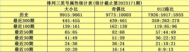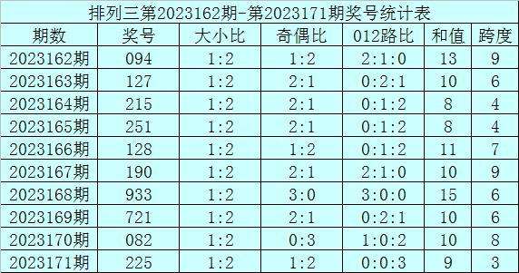 上期回顾:排列三第2023171期奖号为225,奖号012路比为0:0:3,奇偶比为1:2,大小比为1:2,和值为9,跨度为3。