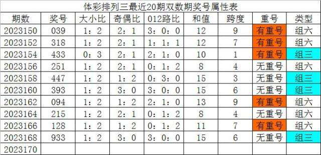 体彩排列三最近20期双数期奖号分别为:039、318、433、251、447、393、094、215、128、933,各期奖号详细属性下表: