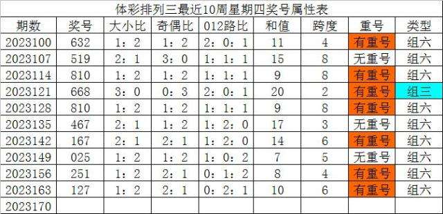 体彩排列三最近10周星期四奖号分别为:632、519、810、668、810、467、167、025、251、127,各奖号属性详见下表: