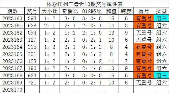 体彩排列三最近10期分别开出奖号:393、536、094、127、215、251、128、190、933、721,各奖号属性详见下表: