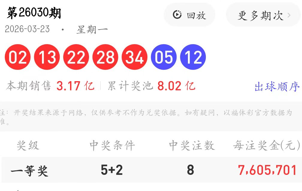 大乐透第2026030期开奖号码:02、13、22、28、34+ 05、12, 开出一等奖8注,奖池累计奖金:8.02亿元 ,详细数据见下图: