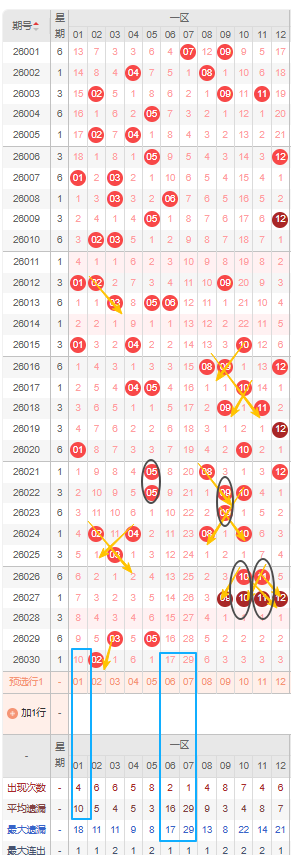 本期一区首先建议关注隔断号,比如09号,前两次开出09号时间隔了3期,本期距离上次开出间隔了3期,本期如果开出将形成3-3的形态规律,其次考虑冷号,比如6号和7号,都已经遗漏十期以上且达到最大遗漏值的冷号,比如06号,已遗漏十期以上且达到平均最大遗漏期数,建议防冷号开出。其次考虑01号,同样已经遗漏十期以上,另外03号也可以考虑开出邻号。