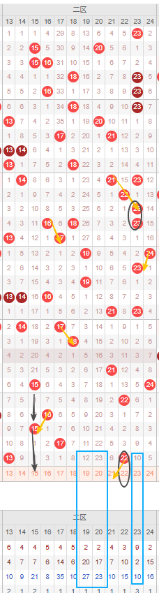 由图可见二区的重号几率并不算很小,近20期开出了2次重号,而上次开出重号已经间隔多期,本期可以考虑继续开出上期开出的22号重号。邻号可以考虑上期开出的22号的邻号21号。隔断号可以考虑15号,若本期开出将形成2-2的形态规律。