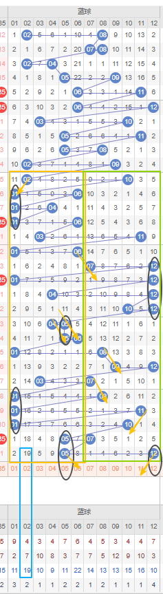 大小号形态:上期开出的一大一小形态,蓝球近20期开出一大一小形态的期数占了半数,那么本期再次开出一大一小形态的概率是很大的,建议看好一大一小形态。比如小号02号和大号11号,不仅是一大一小形态,并且02号都已经遗漏十期以上,且已达到最大遗漏期数,建议防冷号开出。11号还可以考虑本期作为上期开出的12号的邻号开出。