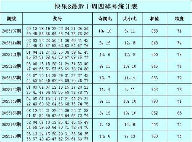 福彩快乐8第2023170期(上周四)开奖回顾:03 13 14 15 20 29 31 33 34 35 36 37 40 45 47 52 59 61 69 77,其中奖号和值为750,跨度为74,奇偶比为14:6,大小比为7:13。