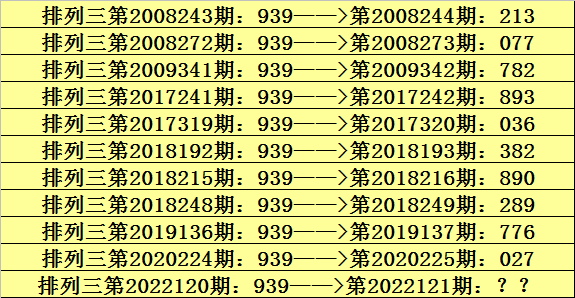 第2022120期排列三奖号为939,历史上该号码组选开出21次,下期奖号分别为:281、213、077、634、782、150、990、241、546、152、888、893、036、382、890、289、776、389、027、947。