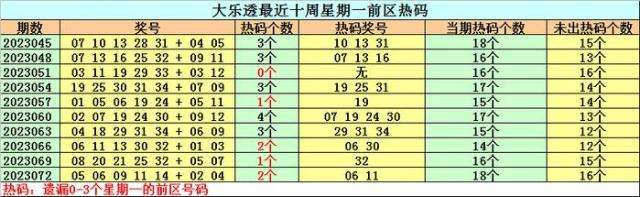 热号分析:最近十周星期一前区热号出现22个,每期平均开出2。2个,热号与理论个数基本相当,上周星期一热号开出2个,热号开出频率较低,当前星期一热码有17个,本周星期一预计热号继续低走,预计出现1-2个,热号参考34。