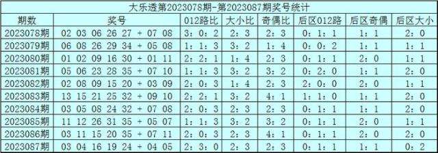 体彩大乐透第23087期奖号为:03 04 16 19 24+04 05,前区奖号012路比为2:3:0,奇偶比为2:3,大小比为2:3,后区0路号码轮空。