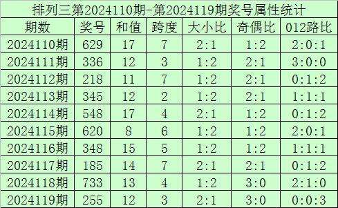上期回顾:排列三第2024119期开奖号:255,奖号和值:12,奇偶比3:0,大小比2:1。