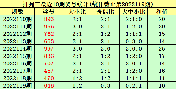 上期回顾:排列三第2022119期奖号为:046。奖号类型:组六,和值:10,奇偶比:0:3,跨度:6,大小比:1:2。