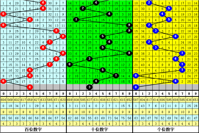大中小分析:在组选0-9号码分布图中,前10期小号(0-2区段)出现4枚奖号,中号(3-6区段)出现14枚奖号,大号(7-9区段)出现12枚奖号,上期大号区域轮空,本期防大号转冷,预计7-9区段无号。