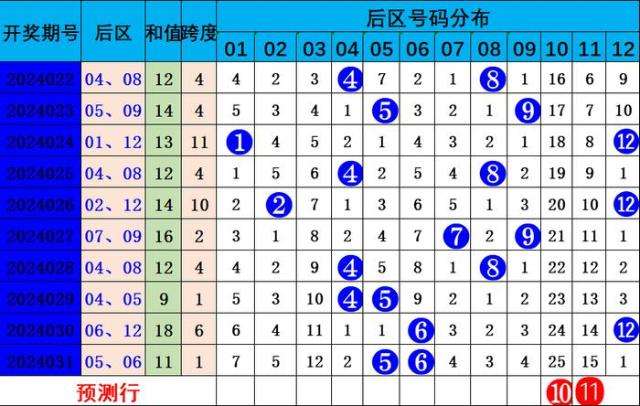 上期开出后区号码:05 06,热热组合。冷热分析:近十期,冷热比4:16,冷号出号较冷,综合分析,本期预测冷冷组合后区回补,关注号码01 02 03 10 11。精准推荐:10 11。