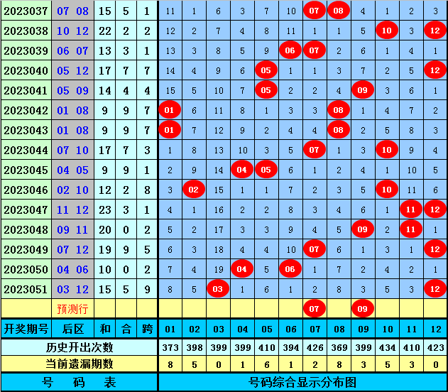 后区分析:后区上期开出全0路奖号03和12,最近20期后区0路奖号开出12个,1路奖号出现15个,2路奖号出现13个,最近8期后区0路奖号出现6个,1路奖号出现6个,2路奖号出现4个,本期后区注意号码:01、04、07、08、09,单挑两码组合07+09。