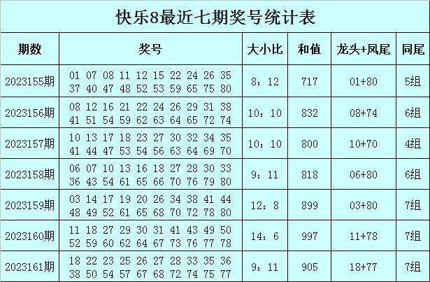 福彩快乐8第2023161期开奖回顾:18 22 23 25 26 27 28 33 35 36 38 50 54 57 67 68 72 74 75 77,其中奖号大小比开出9:11,和值为905,跨度为59,包含7组同尾号:22 72、23 33、54 74、25 35 75、26 36、27 57 67 77、18 28 38 68。