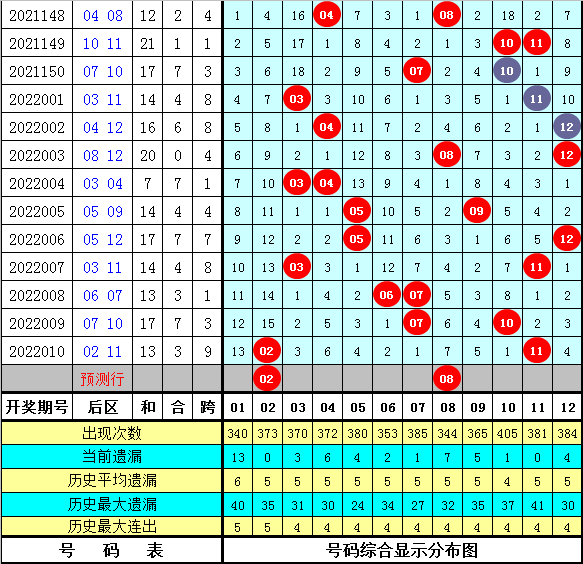 石浩第2022011期大乐透后区分析:后区上周星期一后区奖号为06和07,上期开出奖号02和11,最近9周星期一与最近9期后区奖号大小比都为10:8,奇偶比分别为10:8和9:9,本期看好后区出现全偶组合,关注号码02、04、06、08。