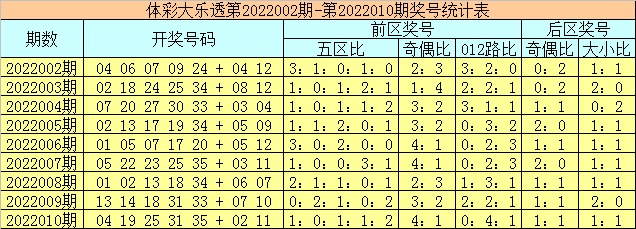 体彩大乐透第2022010期奖号为04 19 25 31 35 + 02 11,前区号码五区比为1:0:1:1:2,奇偶比为4:1,012路比为0:4:1,后区号码奇偶比为1:1,大小比为1:1。