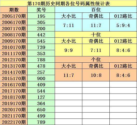 第170期历史同期开奖中,百位号码振幅分别为:2-1-2-1-2-4-4-3-2-7-5-1-4-2-3-2-3,波动范围在1-9之间,大小号码比例开出7:11,奇偶号码比例开出11:7,012路号码比例开出5:9:4,本期百位注意偶数号码,关注号码8。