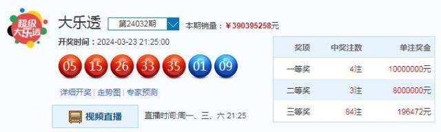 大乐透第24032期开奖。当期开奖号码为:前区05 15 26 33 35,后区01 09。当期前区号码大小比为3:2,奇偶比为4:1,三区比1:1:3;前区开出1枚重号15;后区开出小大组合01 09。