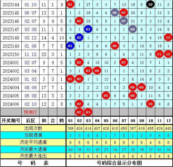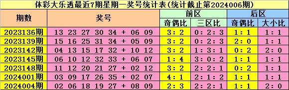上期回顾:体彩大乐透第2024006期开出奖号08 13 16 17 33 + 02 10,其中前区奖号奇偶比为3:2,三区比为1:3:1,后区奖号奇偶比为0:2,大小比为1:1。