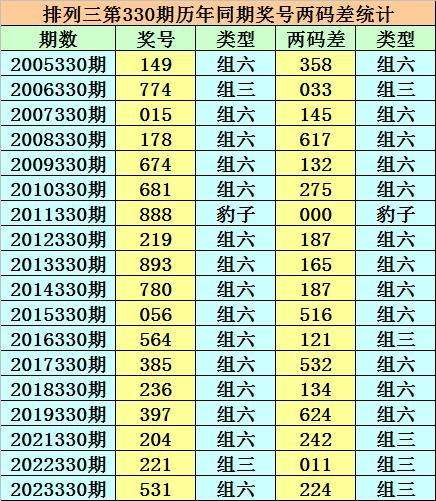 在排列三第330期历史同期开奖中,各号码两码差分别为:358、033、145、167、123、257、000、178、156、178、156、112、235、134、246、224、011、224;