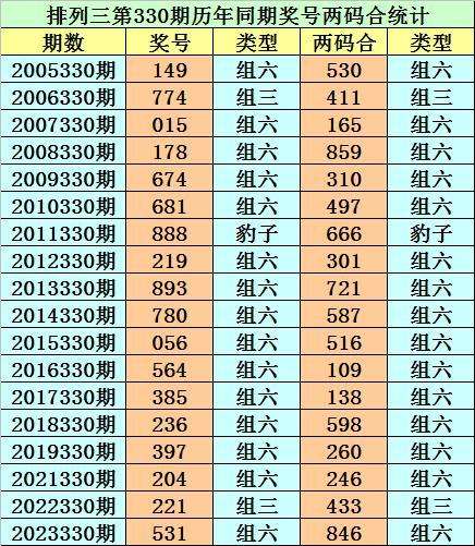排列三从2004年开奖至今已开出7101期奖号了,其中第330期历史同期奖号出现18次,历年第330期分别开出号码:149、774、015、178、674、681、888、219、893、780、056、564、385、236、397、204、221、531。