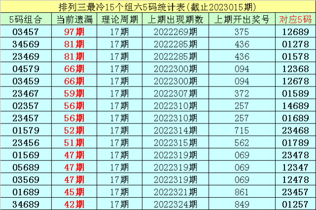 (4)排列三第2023015期遗漏值最大的十个5码组六组合解冻了0个;