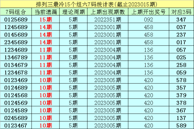 (1)在排列三已开出的6436期奖号中(统计截止第2023015期),目前7码组六遗漏值最大的组合为:0125689,本期遗漏15期;