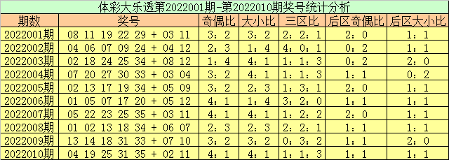 上期回顾:体彩大乐透第2022010期奖号:04 19 25 31 35 + 02 11,其中前区五区比为1:0:1:1:2,奇偶比为4:1,大小比为4:1,和值为114,后区号码大小比为1:1,奇偶比为1:1。