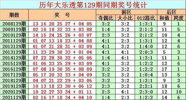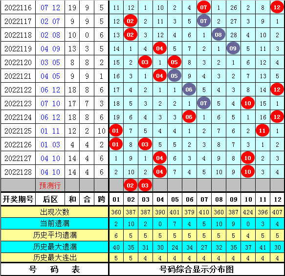 在历史同期开奖中,后区号码和值奇偶为7:7,基本持平,本期看好奇号和值出现,参考和值5。