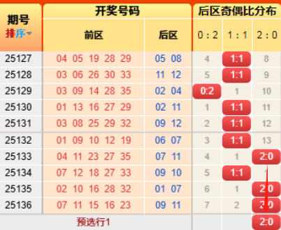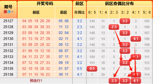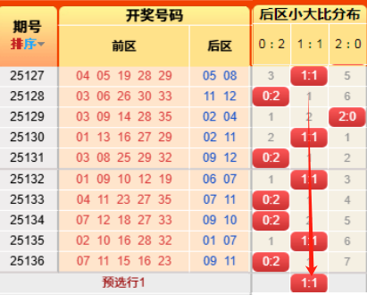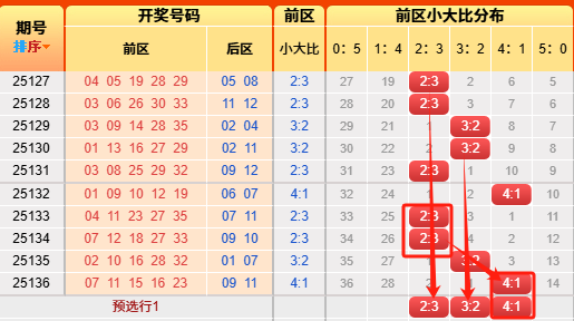 上期前区小大比4:1,推测正确,近期统计57期中51期。言归正传我们继续用历史数据说话,前区小大比分成6种0:5、1:4、2:3、3:2、4:1、5:0(如图),我统计了一下历史出现次数,0:5出现106次、1:4出现513次、2:3出现972次、3:2出现808次、4:1出现352次,5:0出现53次,再看近10期小大比出现次数比为0:0:5:3:2:0,通过历史数据对比观察以及根据遗漏对称理论原则,故本期我们选择2:3、3:2、4:1;(具体精准方向请查看小车小大比精选)