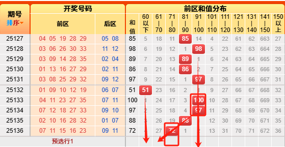 上期开出和值72,又命中和值范围。本次我们先根据历史次数统计,和值60以下开出248次、61-70开出234次、71-80开出368次,81-90开出485次、91-100开出496次,101-110开出380次、111-120开出312次、121-130开出155次、131-140开出90次、141-150开出26次、150以上开出9次,再来看近十次以上和值分别开出了1次、0次、1次、4次、4次、0次、0次、0次、0次、0次、0次 ,低于阈值的有60区间以下、61-70区间、81-90区间、91-100区间、101-110区间、121-130区间,再根据遗漏斜率对称理论,本期注意60区间以下、91-100区间、61-70区间、71-80区间。