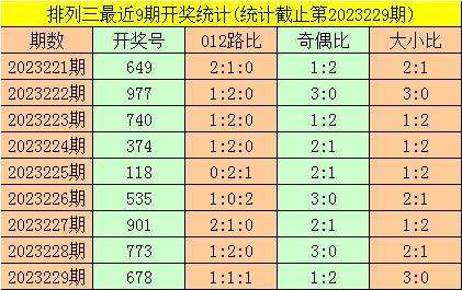 二、体彩排列三前9期奖号开出:649-977-740-374-118-535-901-773-678,其中奖号大小比为16:11,012路比为10:13:4,奇偶比为18:9;
