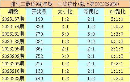 三、体彩排列三前9周星期一奖号分别开出:190-829-779-284-367-758-217-138-740,其中号码012路比为8:11:8,奇偶比为15:12,大小比为15:12;