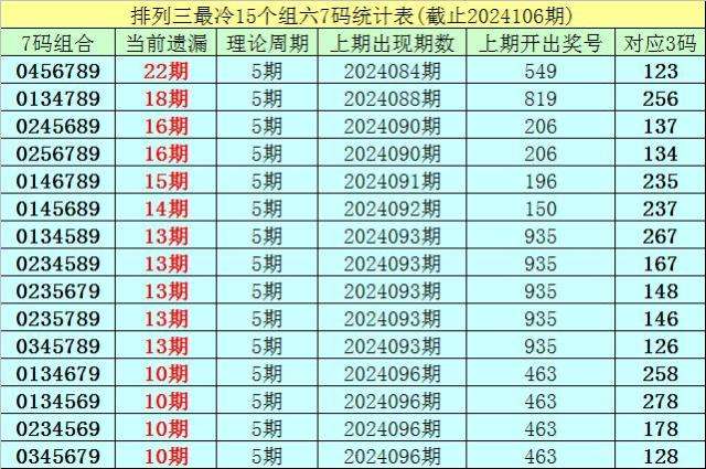 (1)在排列三已开出的6878期奖号中(统计截止第2024106期),目前7码组六遗漏值最大的组合为:0456789,本期遗漏22期;