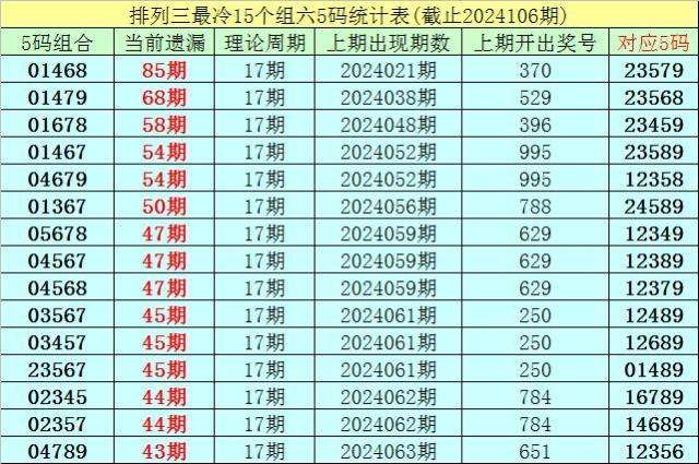 (5)排列三目前遗漏值最大的5码组六组合为:01468,本期遗漏85期,短期解冻的可能性较小,则24107期奖号分布在01468-23579之中的可能性最大。