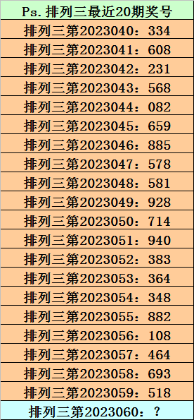第2023059期排列三奖号为518,历史上该号码组选开出29次,下期奖号分别为:598、143、682、000、923、393、205、595、278、669、425、239、470、044、444、467、291、794、751、658、613、489、483、028、712、016、383、928。