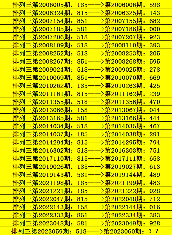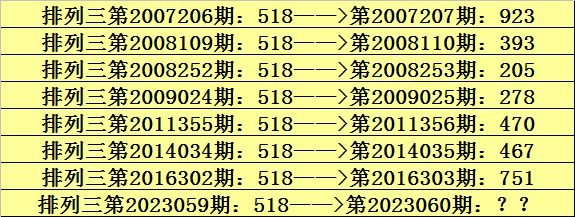 第2023059期排列三奖号为518,历史上该号码直选出现8次,下期奖号分别为:923、393、205、278、470、467、751。