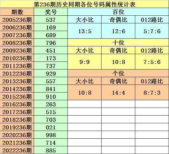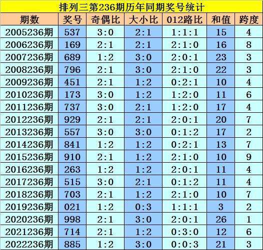 开奖回顾:排列三第2023235期开出奖号424,奖号012路比为0:2:1,大小比为0:3,奇偶比为0:3,最近三年第236期同期开出奖号为:第2020236期:998、第2021236期:714、第2022236期:885。