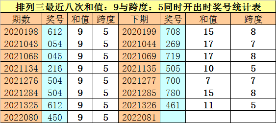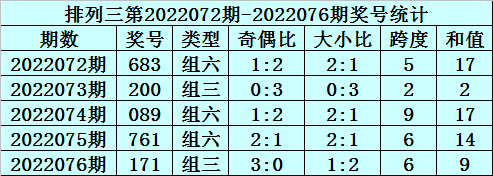 跨度分析:最近5期分别开出跨度:8、3、4、5、7,本期注意跨度走小,参考跨度6。
