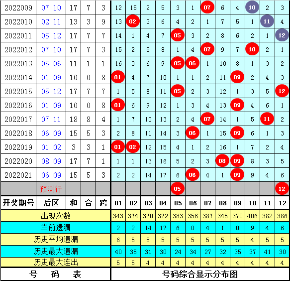 在历史同期奖号中,后区奖号跨度尾数大小比为7:8(定义:跨度1、2、3、10、11为小尾跨度,跨度4、5、6、7、8、9为大尾跨度),出现次数基本持平,本期预计开出大尾跨度,参考跨度7。