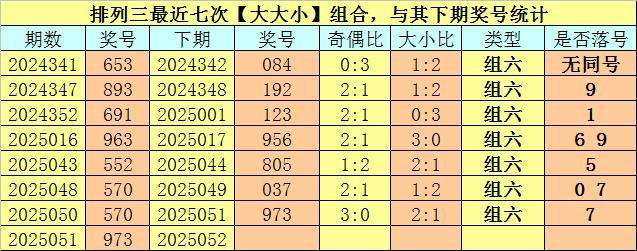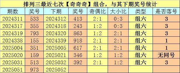 奖号类型分析:排列三最近七次【大大小】组合与【奇奇奇】组合出现之后,其下期组六号码开出14次,其中组六号码开出频率非常热,本期预计继续开出组六号码。另外,其下期有2期没有出现重号,本期不看好开出重号。