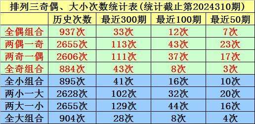 大小、奇偶分析:在连续40期奖号中,全小出现7期,当前遗漏7期、两小一大出现14期,当前遗漏1期、两大一小出现15期,当前遗漏0期、全大出现4期,当前遗漏9期,本期看好开出全大;全偶有7次,目前遗漏12期、两偶一奇有23次,目前遗漏1期、两奇一偶有17次,目前遗漏0期、全奇有3次,目前遗漏10次,本期预计出现两偶一奇。
