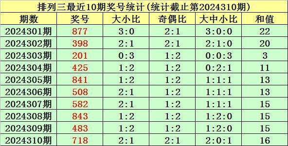 上期回顾:排列三第2024310期奖号为:718。奖号类型:组六,和值:16,奇偶比:2:1,跨度:7,大小比:2:1。
