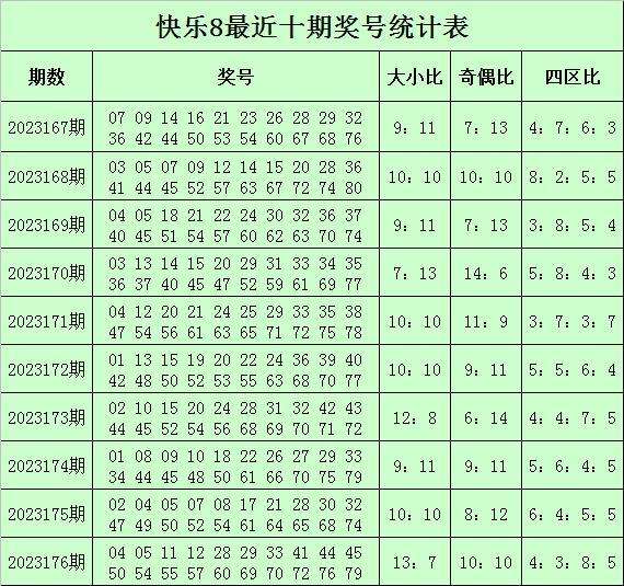 福彩快乐8第2023176期开奖回顾:04 05 11 12 28 29 33 41 44 45 50 54 55 57 60 69 70 72 76 79,其中奖号四区比为4:3:8:5,奇偶比为10:10,大小比为13:7。