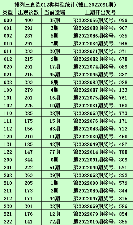 上期回顾:体彩排列三第2022091期开出奖号:809,其012路比为2:0:1,奖号012路类型为:200。