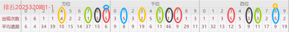 下图所圈出的为近30期各位置所出现的热码出现次数及平均遗漏值,用以参考和一些冷码组合选号。
