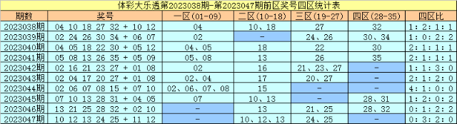许老六大乐透第2023048期前区四区划分分析(定义:01-09段为一区,10-18段为二区,19-27段为三区,28-35段为四区):